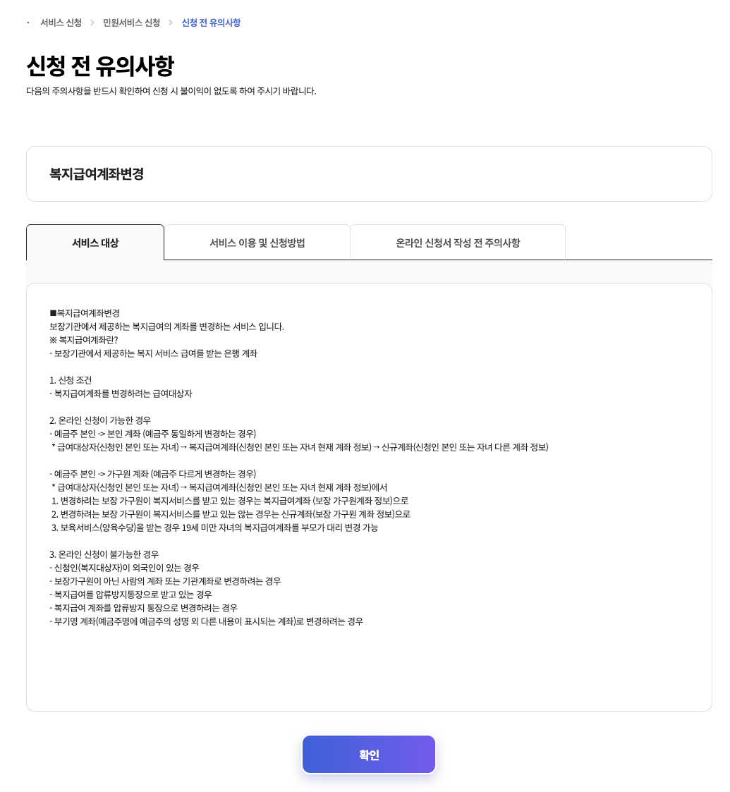 - 로그인 → “서비스 신청” → “민원서비스 신청” → “복지급여계좌변경” 메뉴 선택.