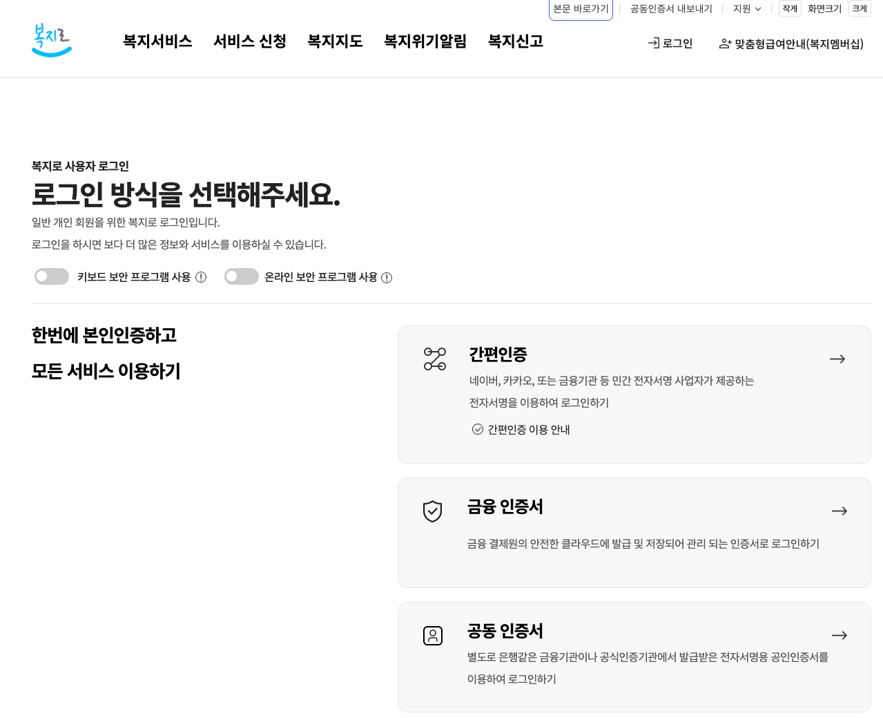 - 간편인증, 금융인증서 또는 공동인증서 중 사용 가능한 방식 선택.